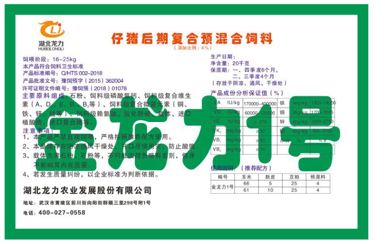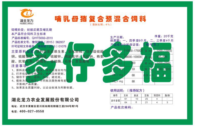 湖北龍力農業(yè)發(fā)展股份有限公司坐落于武漢市黃陂區(qū)前川街向陽街群順三里298號附1號。公司成立于2014年6月,公司自成立以來把“創(chuàng)全球最大養(yǎng)豬綜合服務”為企業(yè)愿景。致力于打造教保料品牌”作為公司發(fā)展的明確目標。公司一直致力于豬營養(yǎng)的研究和開發(fā),積極與國內外高校和科研機構合作,推廣養(yǎng)豬技術、動物營養(yǎng)新概念,向世界農牧企業(yè)學習與合作。公司采用國內先進的生產工藝,選擇高精度電子配料秤,高均勻度、無殘留混合機等先進設備....